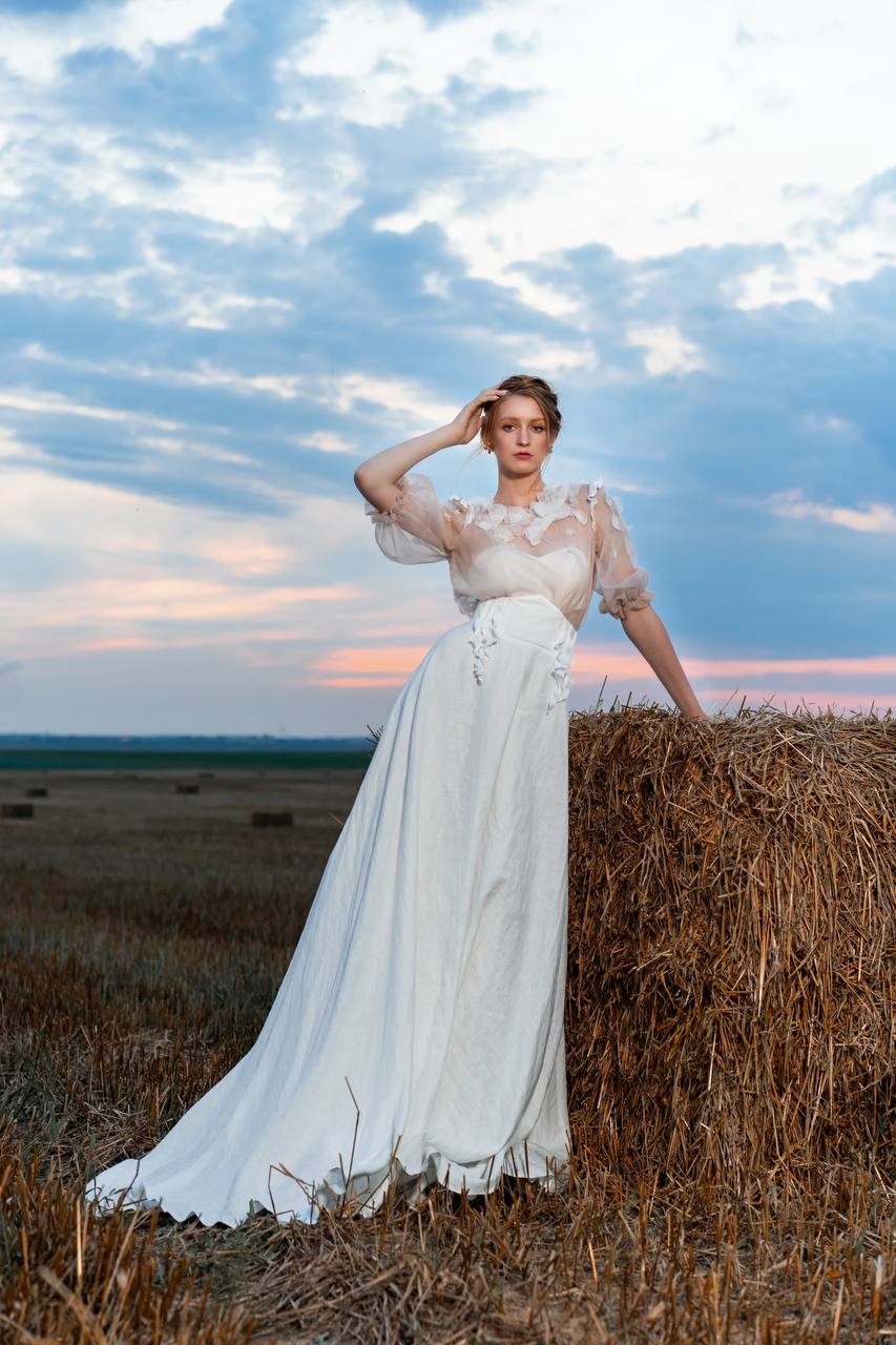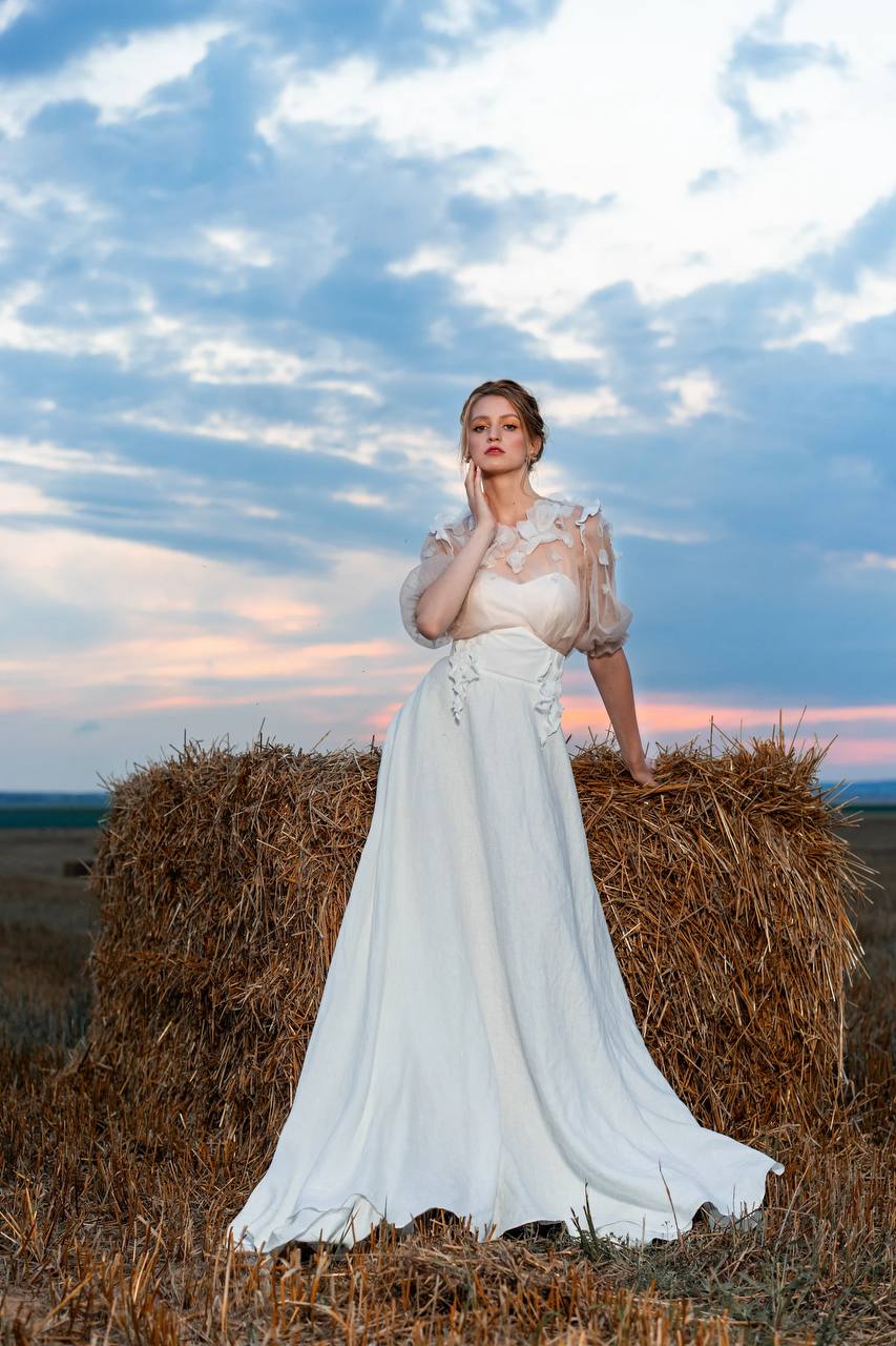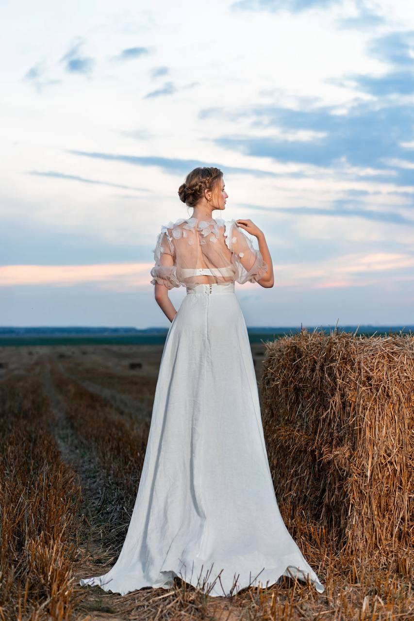 Это платье — воплощение гармонии между природной красотой белорусского льна и воздушной лёгкостью фатина. Корсетный лиф с идеальной посадкой мягко моделирует силуэт, подчёркивая все достоинства фигуры, в то время как струящиеся фатовые слои создают эффект невесомого движения.