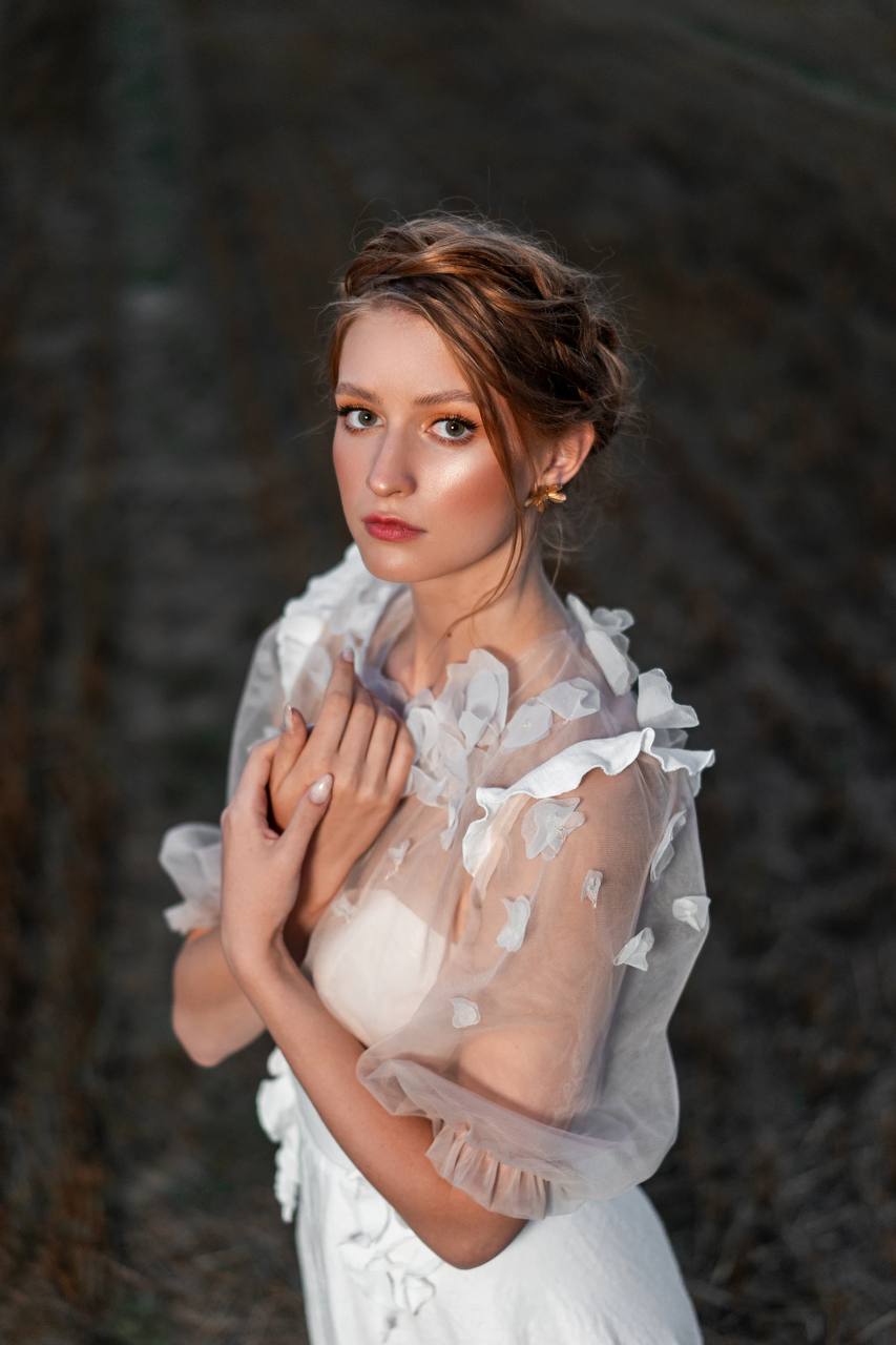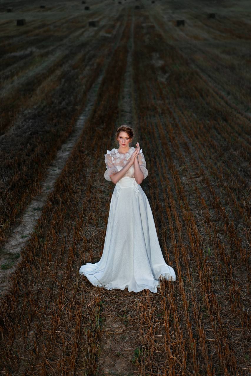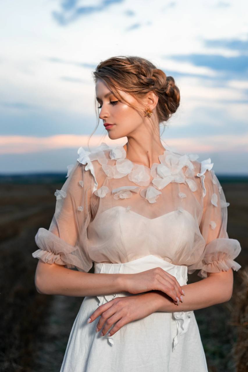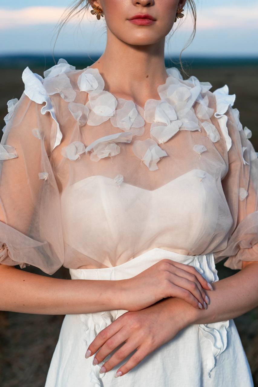 Это платье — воплощение гармонии между природной красотой белорусского льна и воздушной лёгкостью фатина. Корсетный лиф с идеальной посадкой мягко моделирует силуэт, подчёркивая все достоинства фигуры, в то время как струящиеся фатовые слои создают эффект невесомого движения.